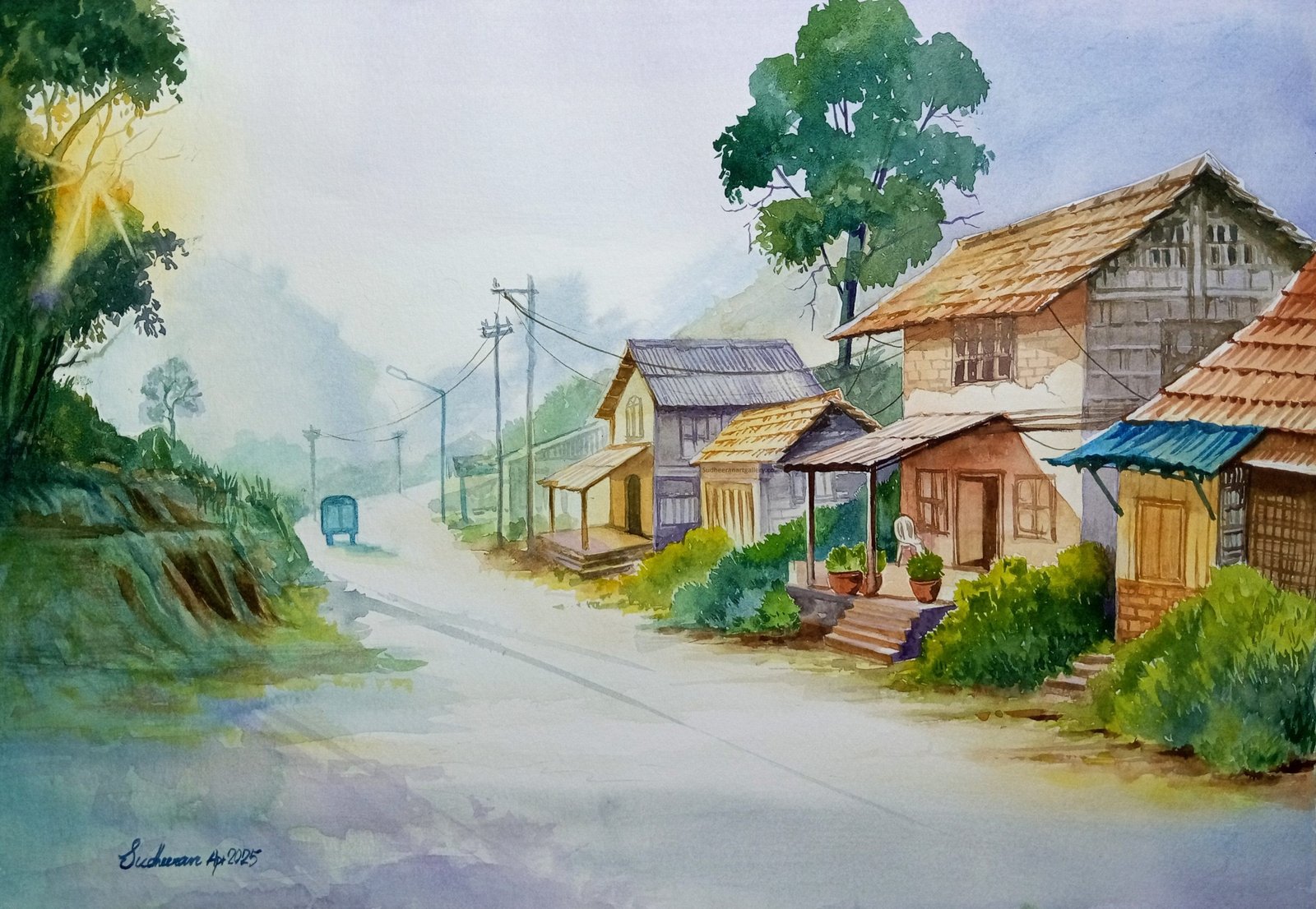 “A Village View”using watercolor (Winsor & Newton) on Strathmore 400 Series paper (300 gsm, 18×24 inches). Just finished this piece capturing the quiet charm of a countryside morning. The soft sunlight filtering through the trees, the calm road leading into the mist, and the cozy homes with welcoming porches—each detail was painted with peace in mind. I wanted to reflect the simplicity and warmth of village life in early light.