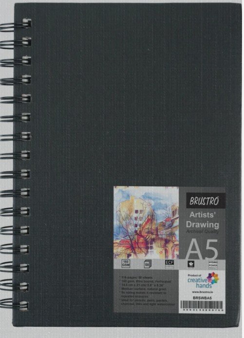 The Brustro Artists Sketch Book Wiro Bound in A5 size (14.8 cm x 21 cm) is a high-quality sketchbook designed to meet the needs of artists, designers, and illustrators. With 116 pages of 160 GSM acid-free paper, it provides a smooth, durable surface ideal for dry media such as pencil, charcoal, graphite, pen, and pastels. The acid-free property ensures long-lasting artwork without yellowing or deterioration over time. Its sturdy wiro binding allows the pages to lie completely flat or be flipped around for ease of use, making it convenient for sketching on the go. Compact and portable, this sketchbook is a reliable companion for daily practice or professional art projects.