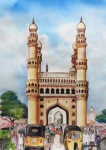 Charminar is an iconic monument located in Hyderabad, India. Built in 1591 by Sultan Muhammad Quli Qutb Shah, it is a magnificent structure that stands as a symbol of the city’s rich history and cultural heritage. The name “Charminar” translates to “Four Towers” in English, referring to the monument’s distinctive four grand arches that face each of the cardinal directions.