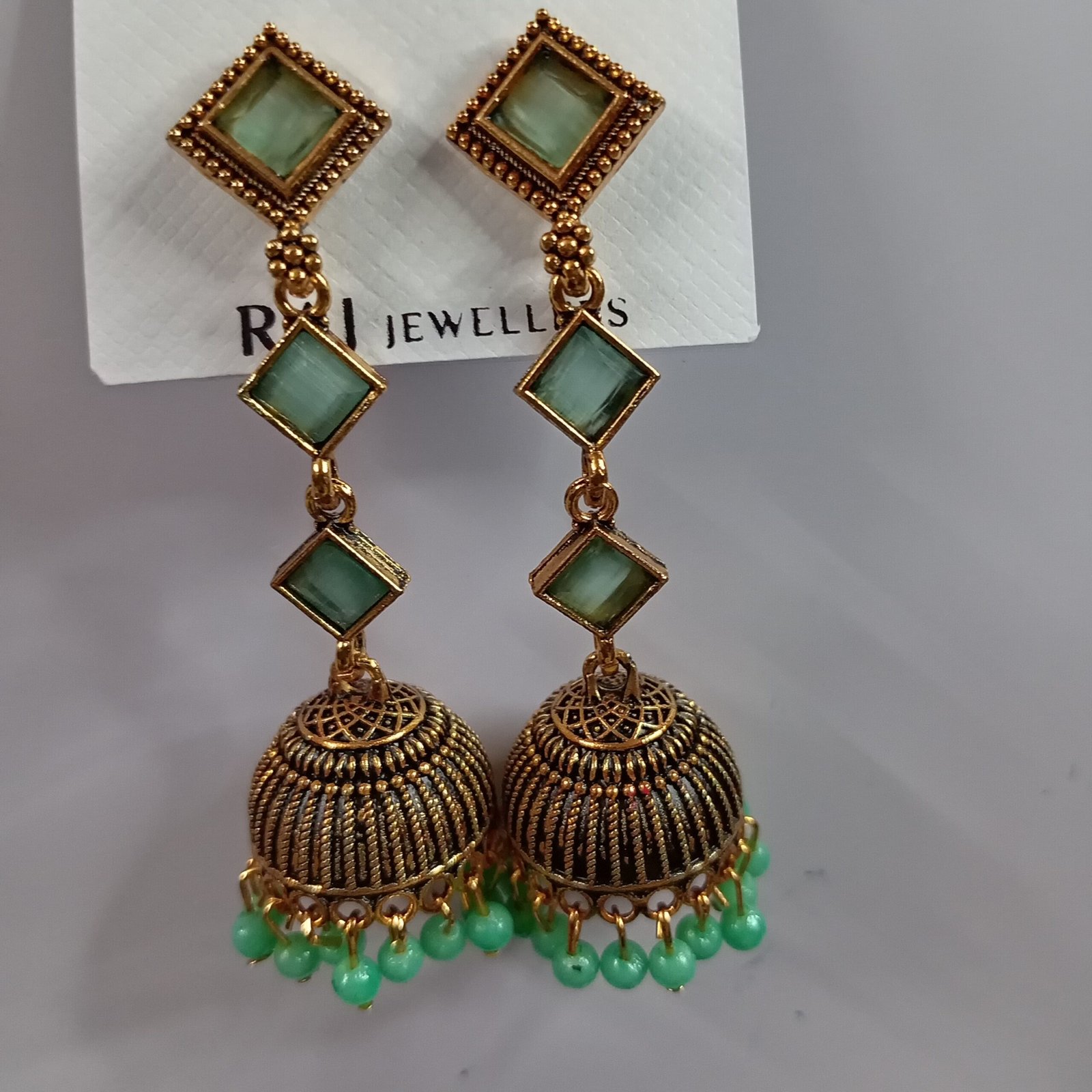 Jimuki Metal Jhumki Earring Green drops with Rectangle Designs