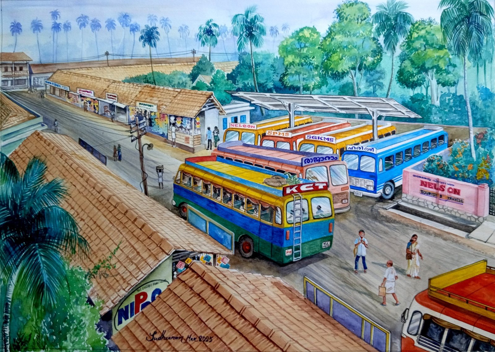 Nostalgic watercolor painting-90s Private bus stand of Kalyankulam, Kerala